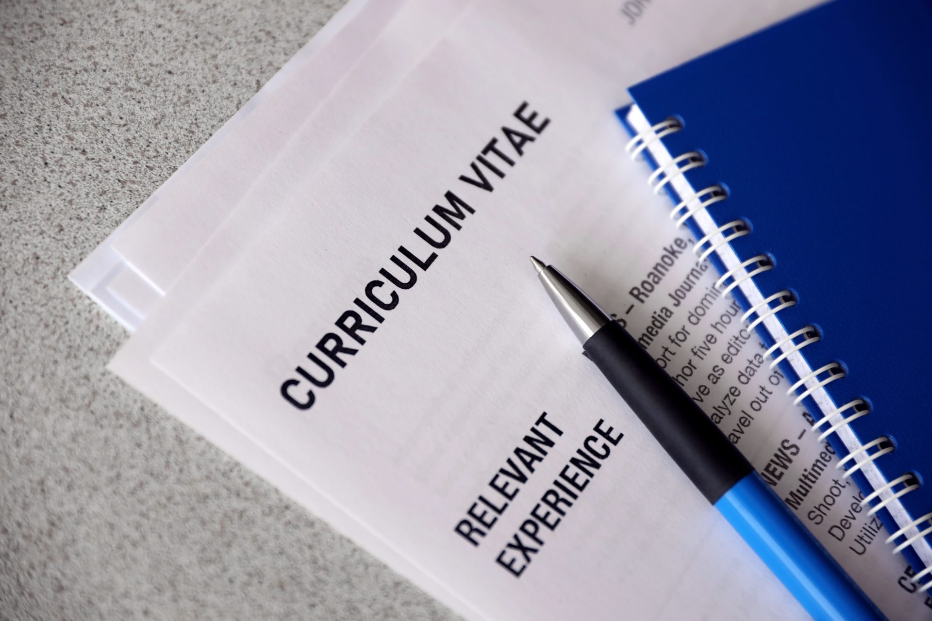 Top view of stack of office documents including resume and cv forms on the desk close to pen and notepad. Job seeking process. Hunting for workplace