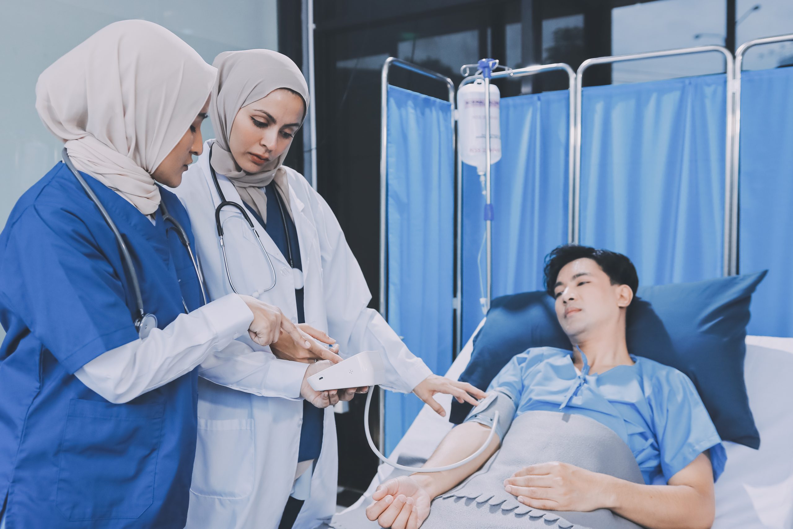 A young man lies on a bed in a hospital ward talking with her young Indian doctor. Doctor checking patient’s health doctor treating patient, hospital admission of patient