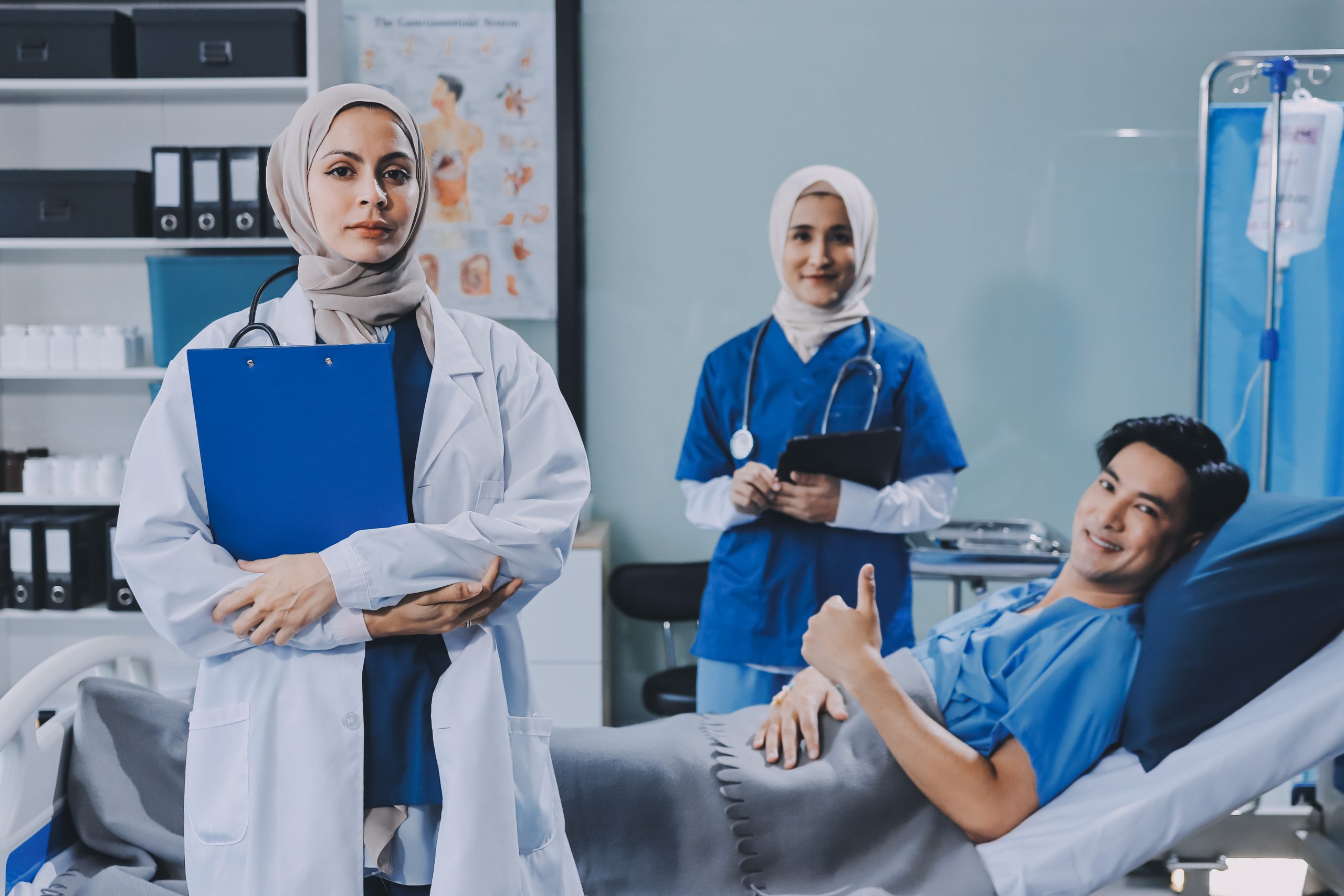 A young man lies on a bed in a hospital ward talking with her young Indian doctor. Doctor checking patient’s health doctor treating patient, hospital admission of patient