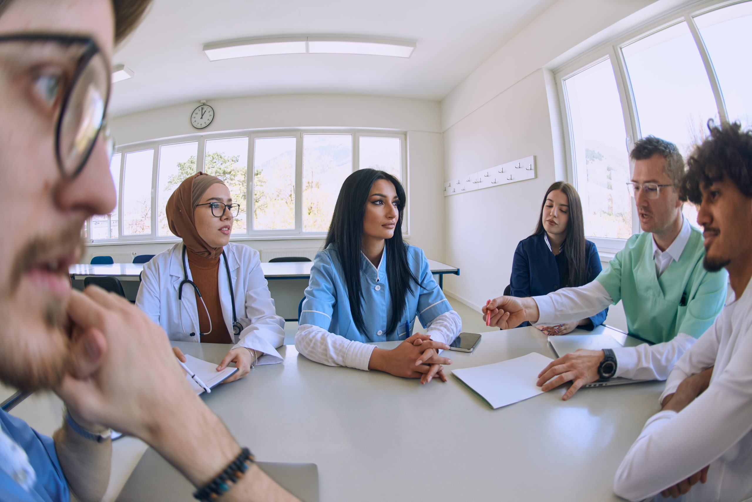A dedicated group of doctors and medical nurses attentively listens to their colleague’s work plan in a healthcare facility, fostering collaboration and ensuring high-quality patient care.