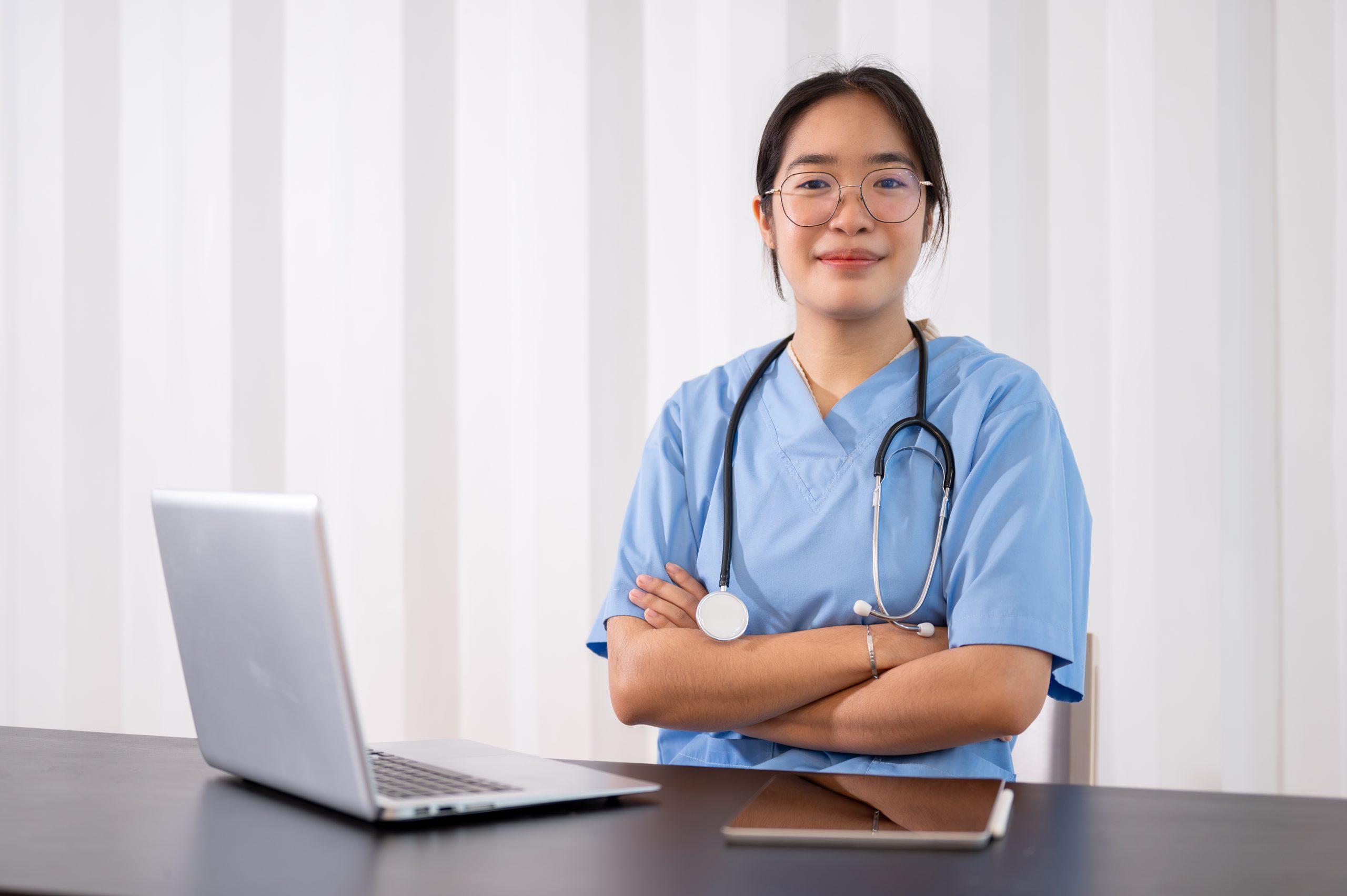 A professional and confident Asian female doctor sitting with her arms crossed at her desk in the office in the hospital. people and medical job concept