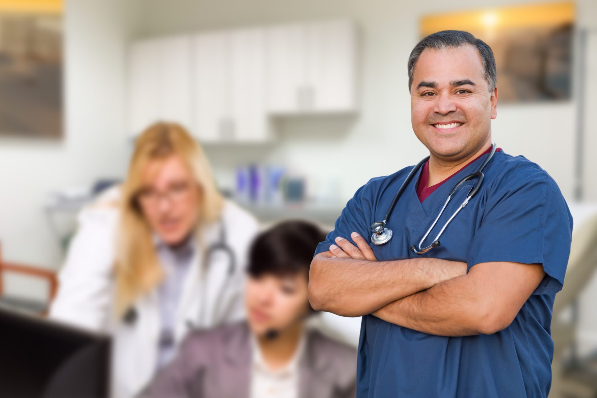 Handsome Hispanic Doctor or Nurse Standing in His Office with Staff Working Behind.