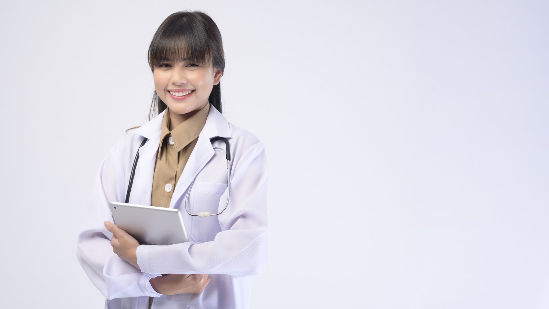 A young female doctor with stethoscope over white background