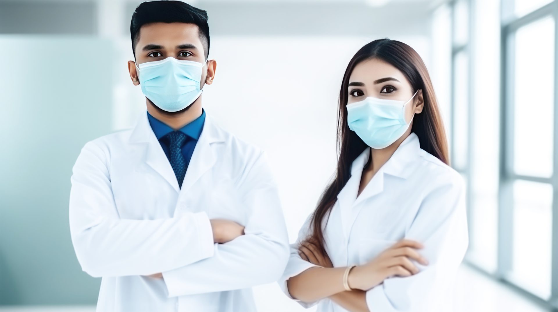 Young Male and Female Doctor Wearing Masks While Standing Together in Hallway of Hospital, Generative AI.