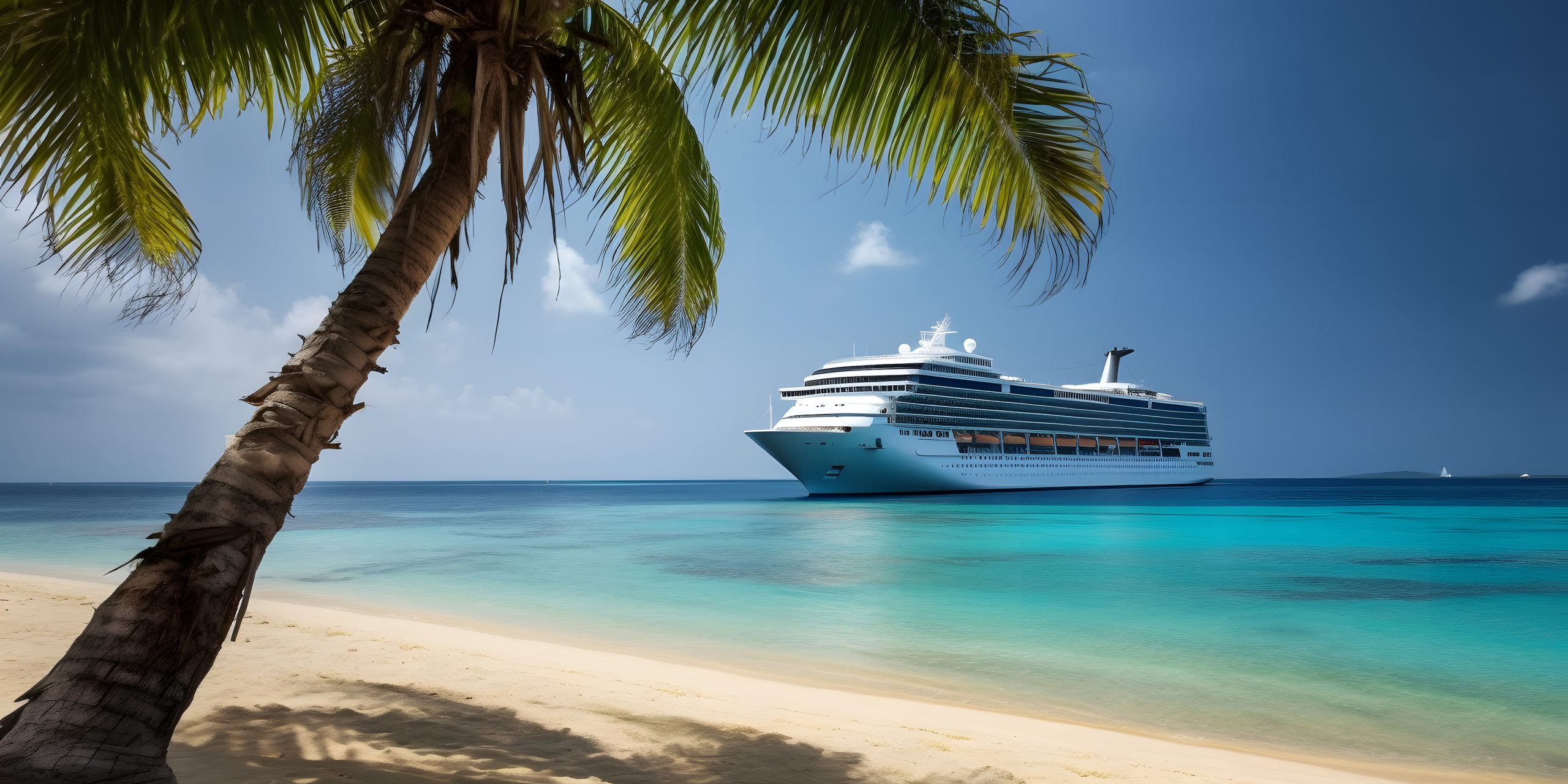 Large cruise liner in the background with a palm tree on white sand coral beach, neural network generated photorealistic image