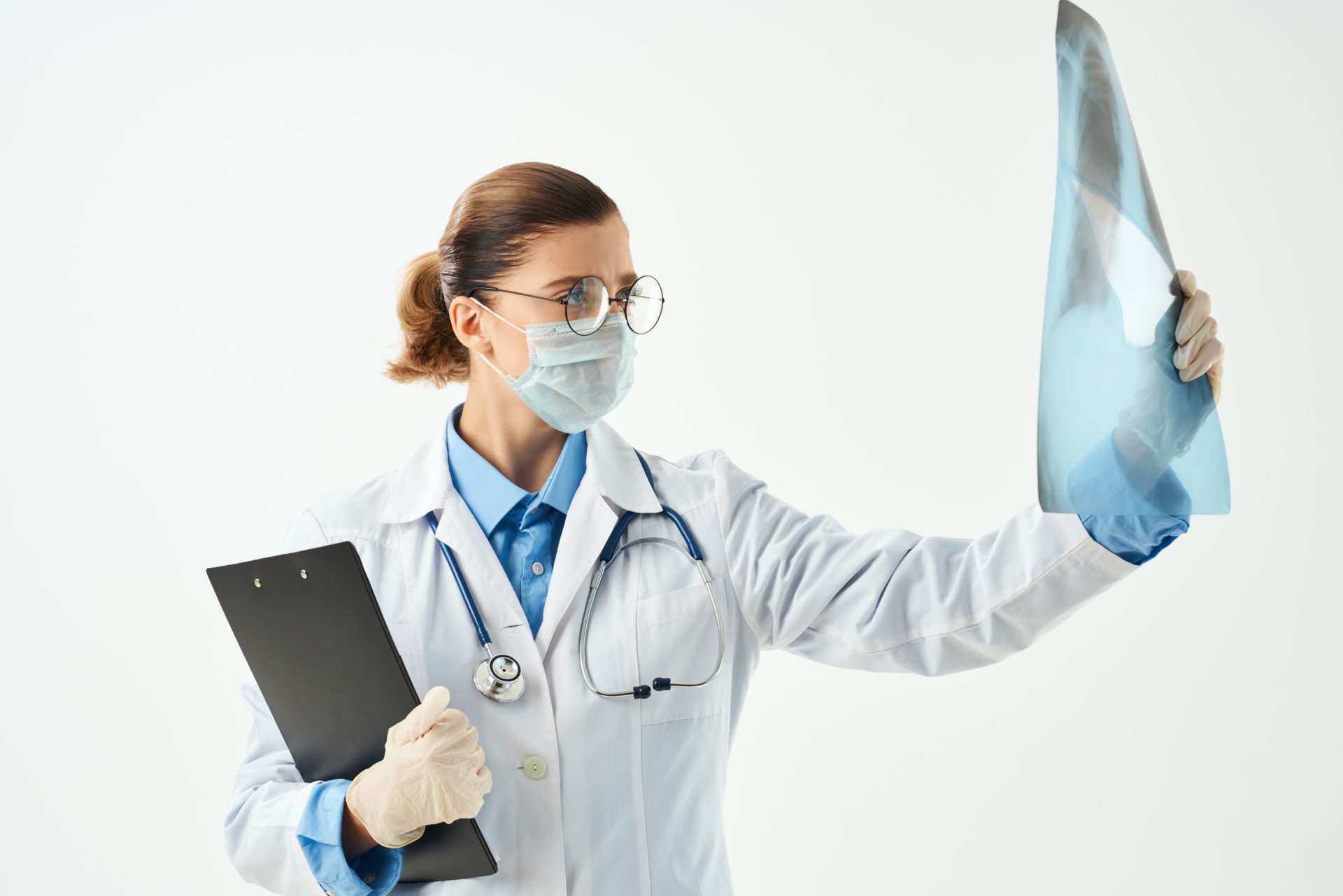 female doctor in white coat medical mask x-ray examination medicine. High quality photo