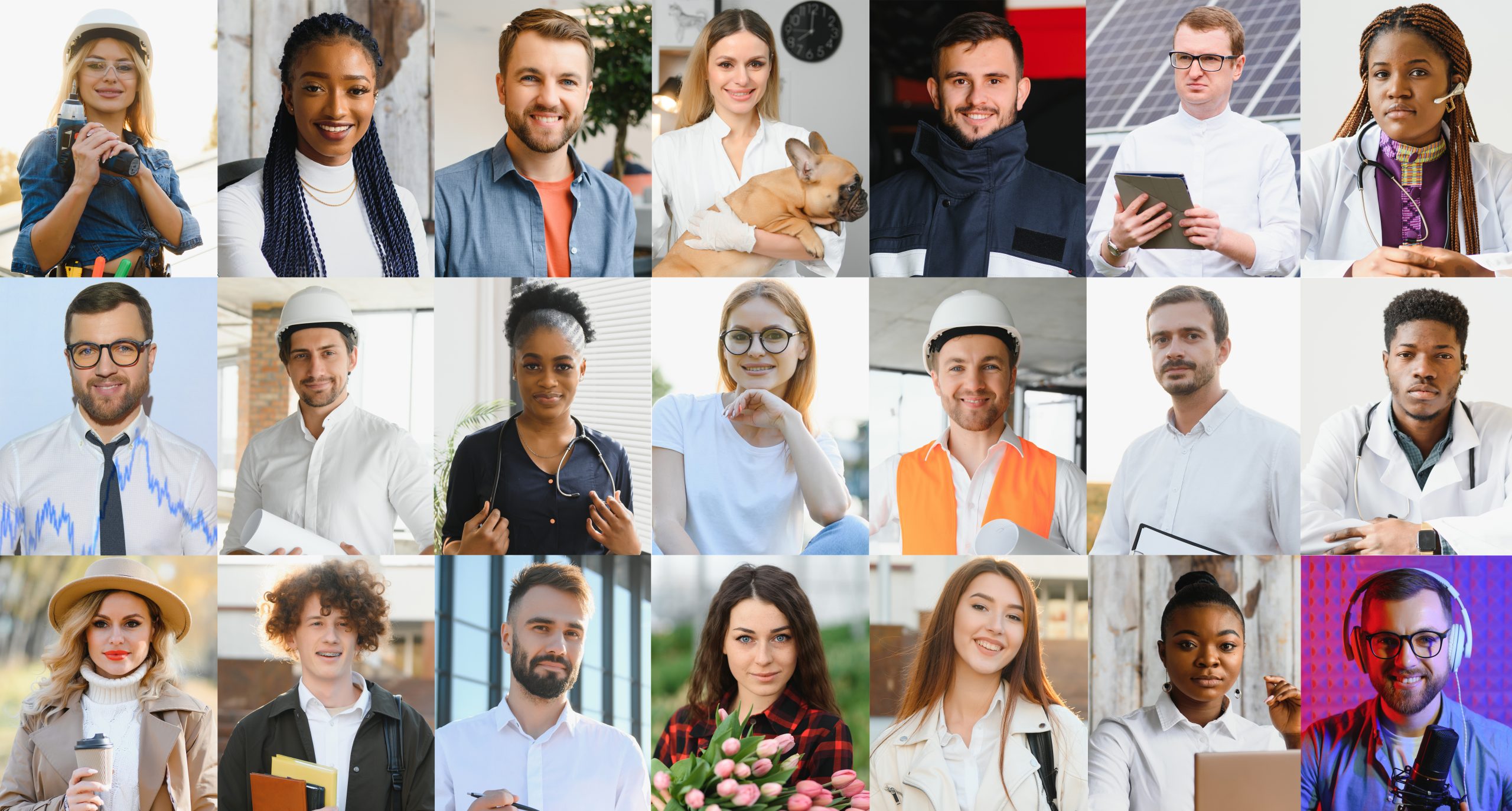 Many happy diverse ethnicity different young and old people group headshots in collage mosaic collection. Lot of smiling multicultural faces looking at camera. Human resource society database concept
