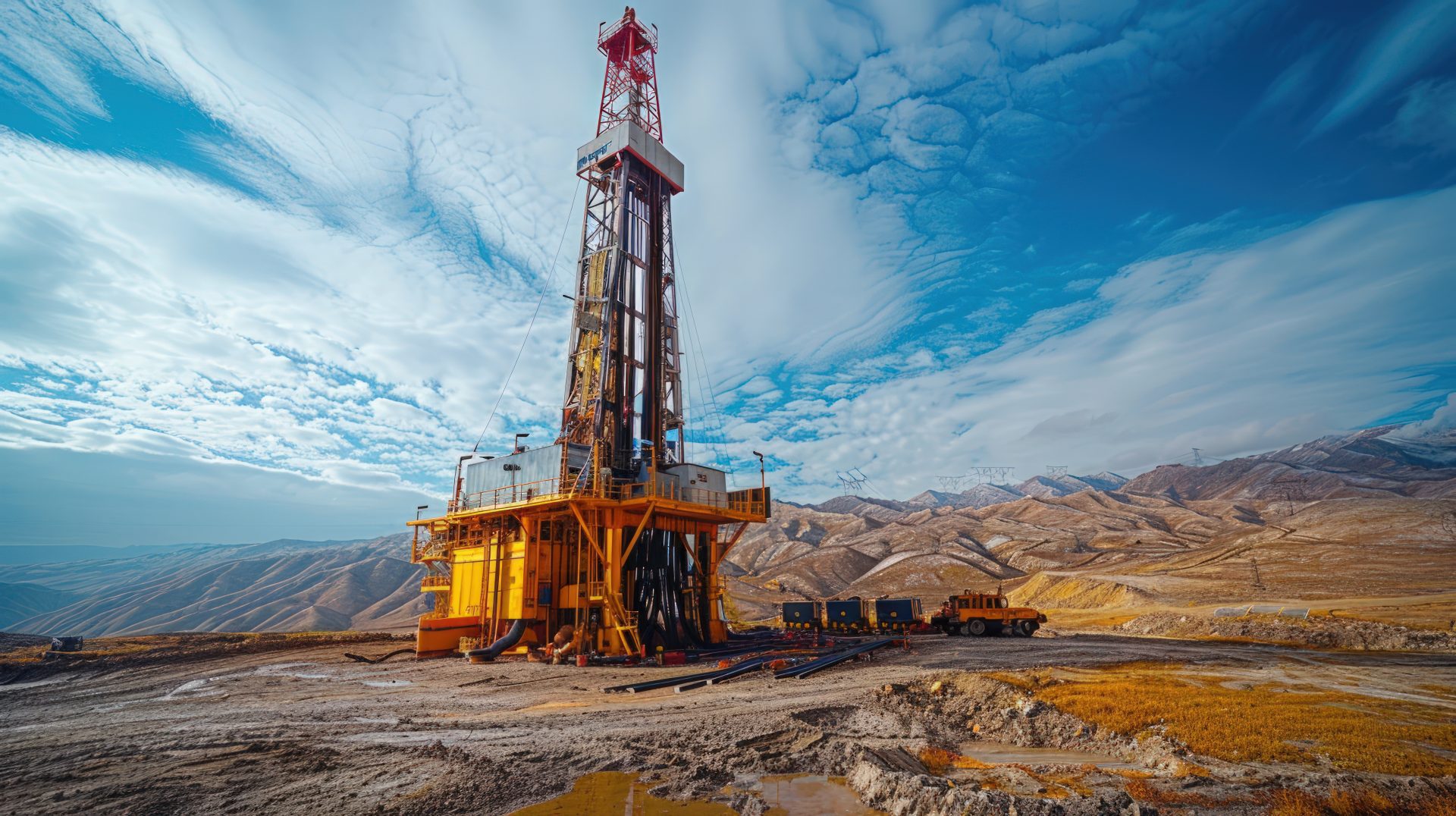 A tall oil drilling rig stands prominently on a vast, barren landscape under a partly cloudy sky. The rig itself is primarily yellow and red, a stark contrast to the earth tones of the surrounding terrain. Rolling hills stretch into the distance, creating a sense of depth and scale. The ground is dry and cracked, suggesting an arid environment. This image could be used to illustrate concepts related to energy production, resource extraction, or environmental impact. It evokes themes of industry and the search for resources in remote regions.